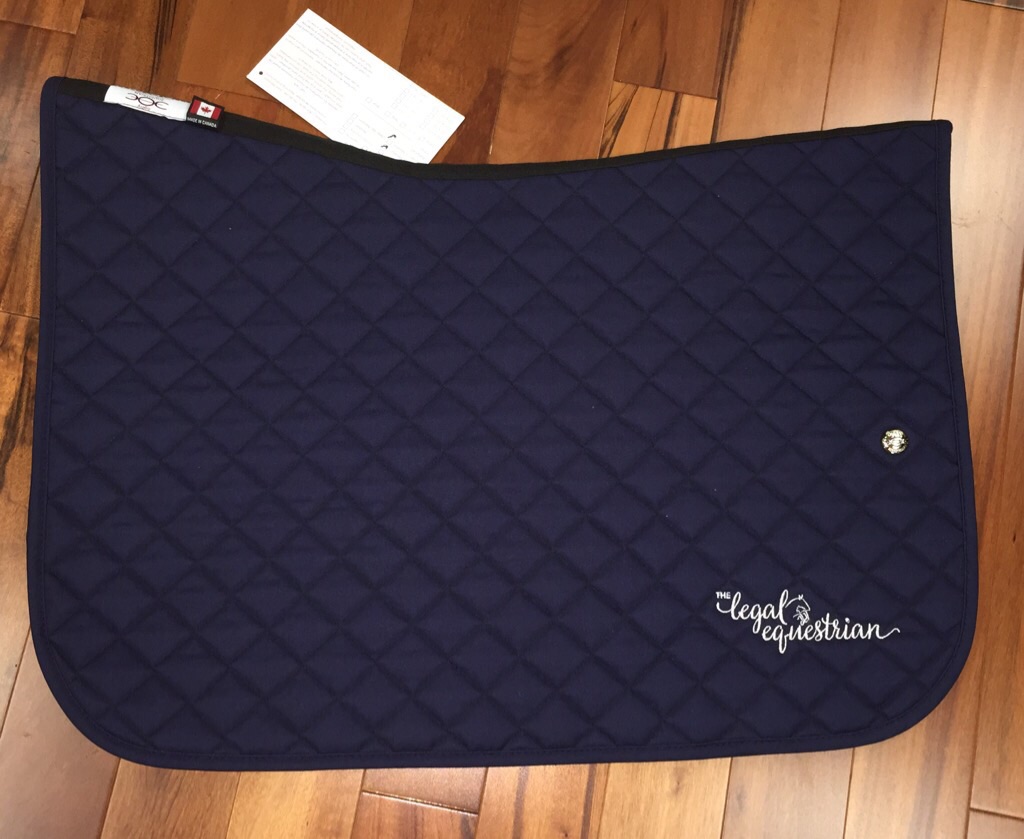 Rep the Legal Equestrian blog while you're at the barn, on a trail ride, in a lesson, or even at a show! This pad. a variation on our original all white pad, has a navy base with navy binding, and The Legal Equestrian logo in white in the back left corner.